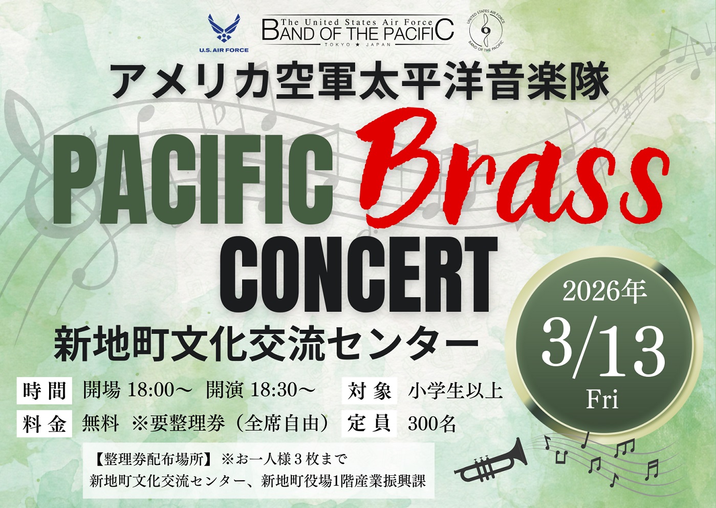 3月13日にアメリカ空軍太平洋音楽隊「パシフィック・ブラス」コンサートを開催します。